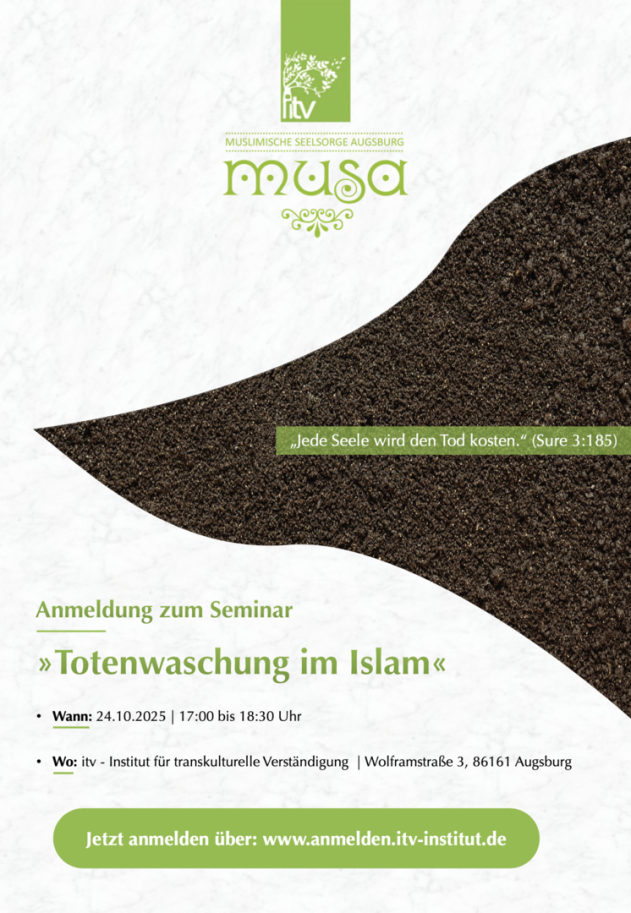 Die Referentinnen Mümine Göker und Yurdagül Yıldırım (Seelsorgerinnen und Koordinatorinnen bei musa) werden die Grundlagen und praktischen Kenntnisse zur rituellen Totenwaschung im Islam vermitteln. Auch die Zeit vor und nach dem Tod wird dabei thematisiert.